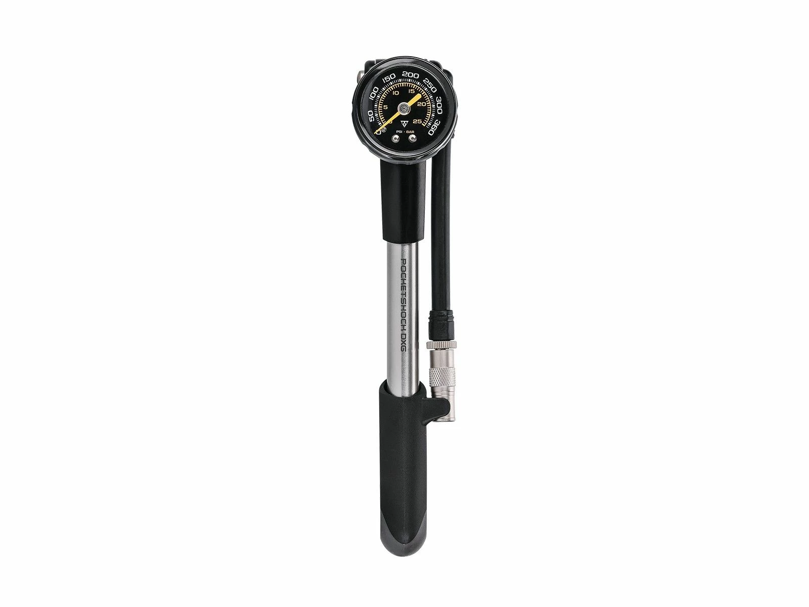 En præcisions gaffel og stødpumpe med et letlæseligt manometer til præcise tryklæsninger op til 360 psi / 24,8 bar. En luftudløserknap og tryk-rite-stikket gør det let at indstille til det korrekte tryk og eliminerer lufttab ved frakobling, mens den fleksible slange tager spænding ud af ventilstammen ved pumpning.